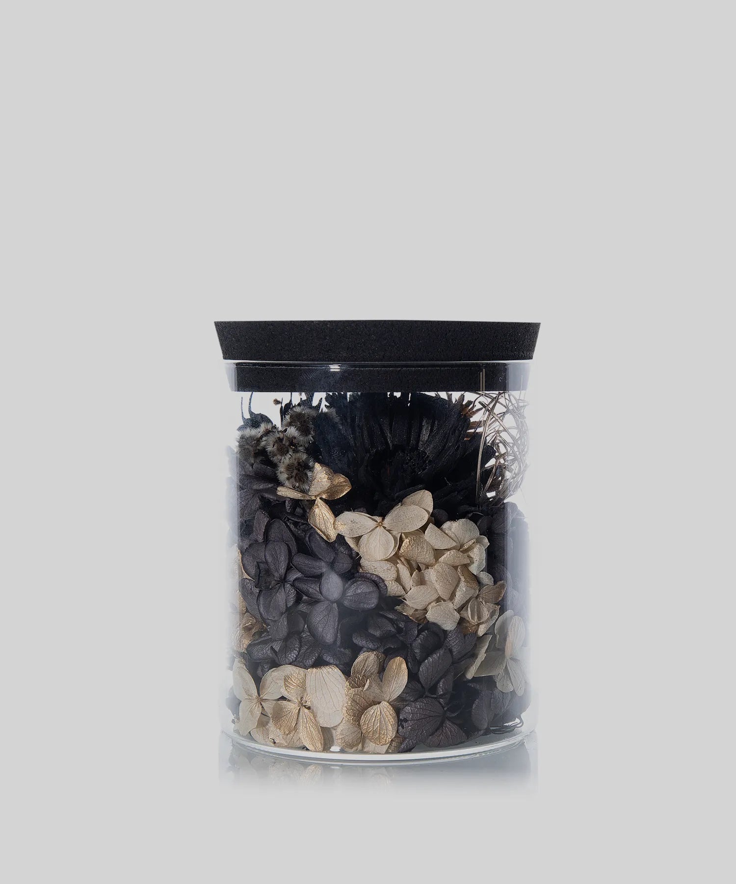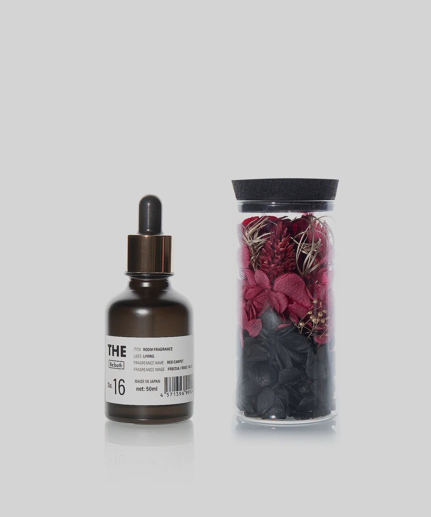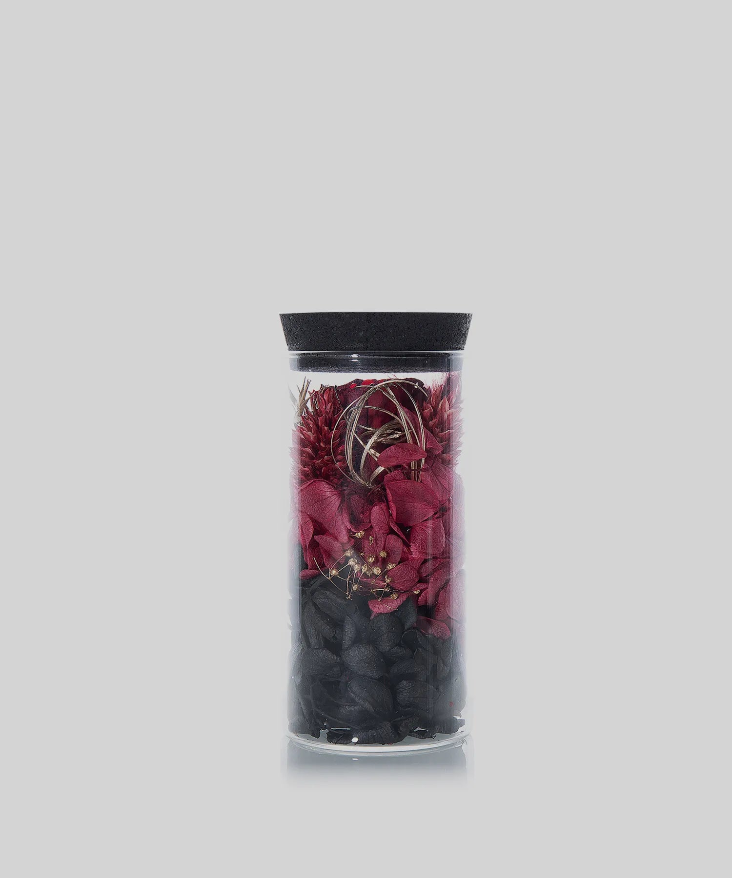 デザイナーの旅の記憶を閉じ込めたプリザーブドフラワーグラスに、情景を香りで描き出すルームフレグランスオイルを添えた特別なセット。