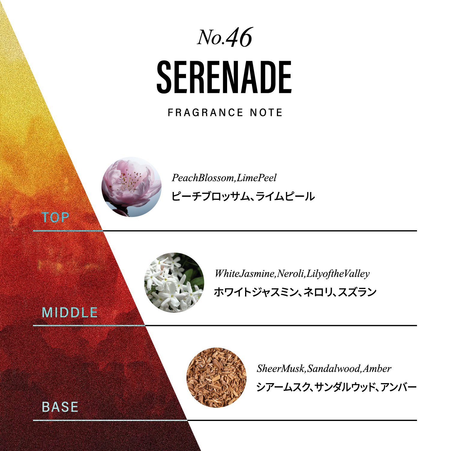 みずみずしいブラックカラントが風のように香り立ち、青さと果実感が広がる。やがて花々の柔らかい香りがゆっくりと中心に咲き、自然の奥深さと静けさを漂わせる。時間が経つにつれ、ムスクと木々のぬくもりが静かに包み込み、しっとりとした落ち着きへと導く。