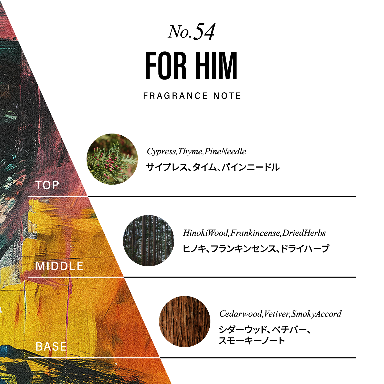 ピリッとしたピンクペッパーと柑橘が溌剌と立ち上がり、スペアミントが涼やかさを添える。やがて、ラベンダーとクローブが中心に現れ、クラシカルかつ大胆な印象を形成。ラストノートはウッディとアンバーの深みに着地し、男性的で堂々とした余韻が持続する。