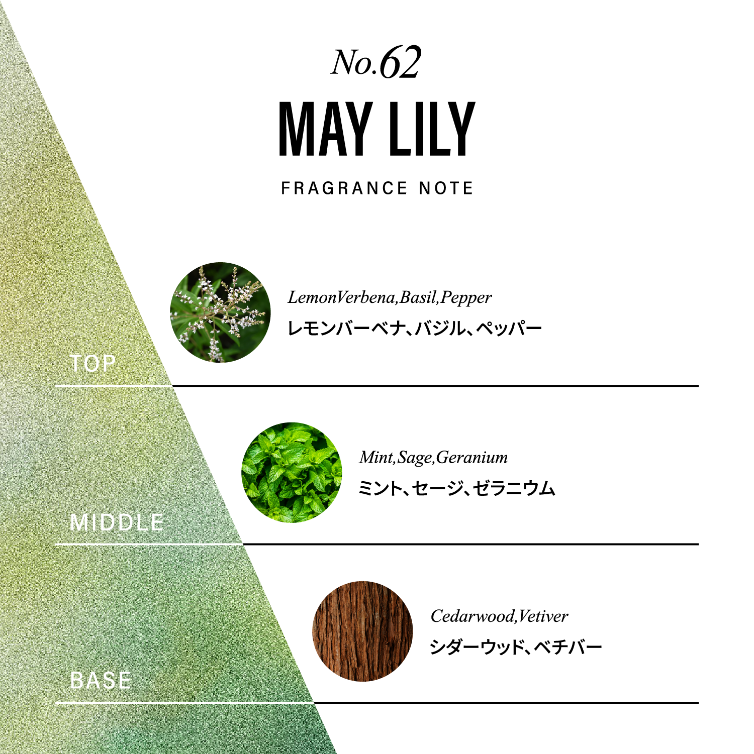 始まりは、グリーンとハーブの清涼感が心を整えるように香り立ちます。次第にホワイトムスクがやわらかく広がり、クラリセージの深みが静けさを与えます。最後には、ウッディな余韻が肌に溶け込むように残り、時間と共に消えていく気配の美しさを感じさせます。
