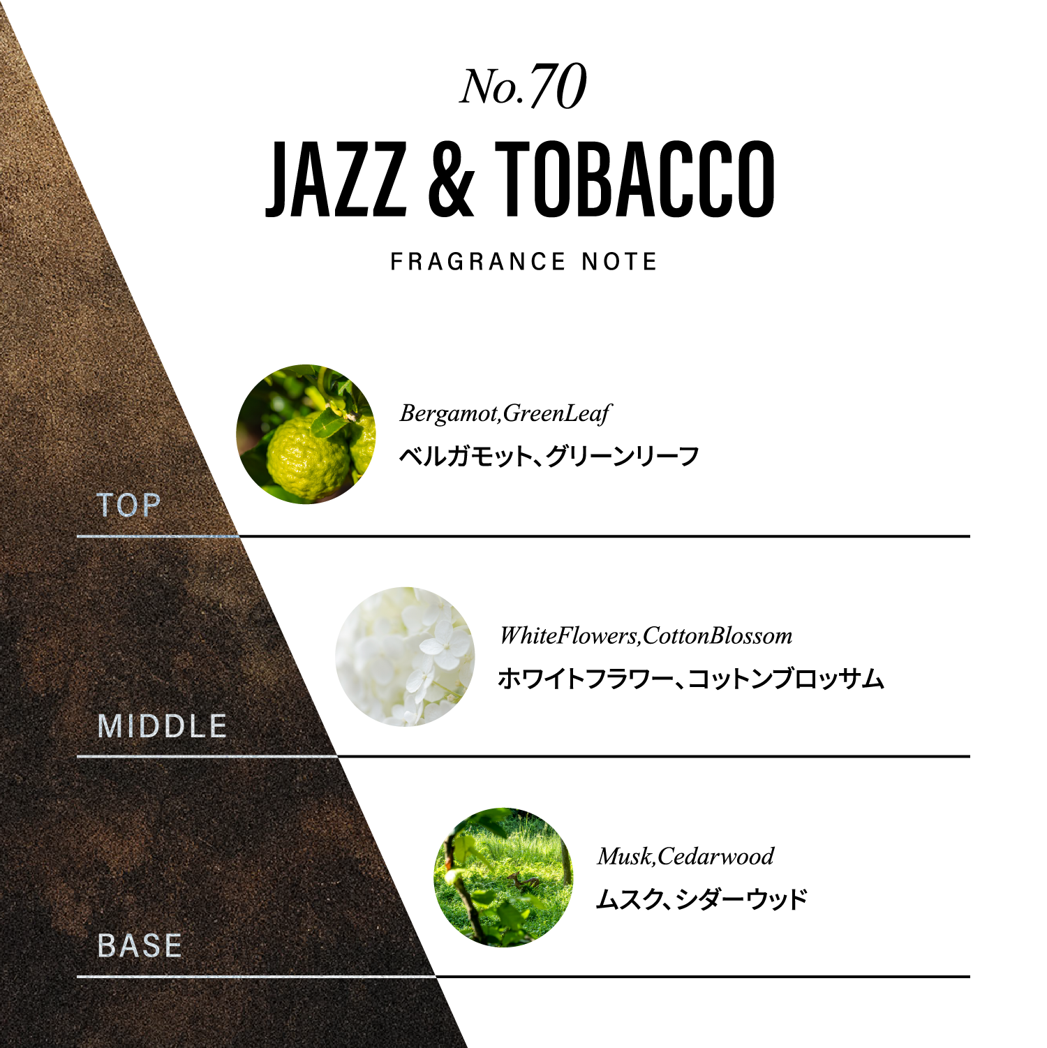 清潔感のあるムスクと、ナチュラルな木の香りが残り香となり、心地よく静かに広がるラストノート。