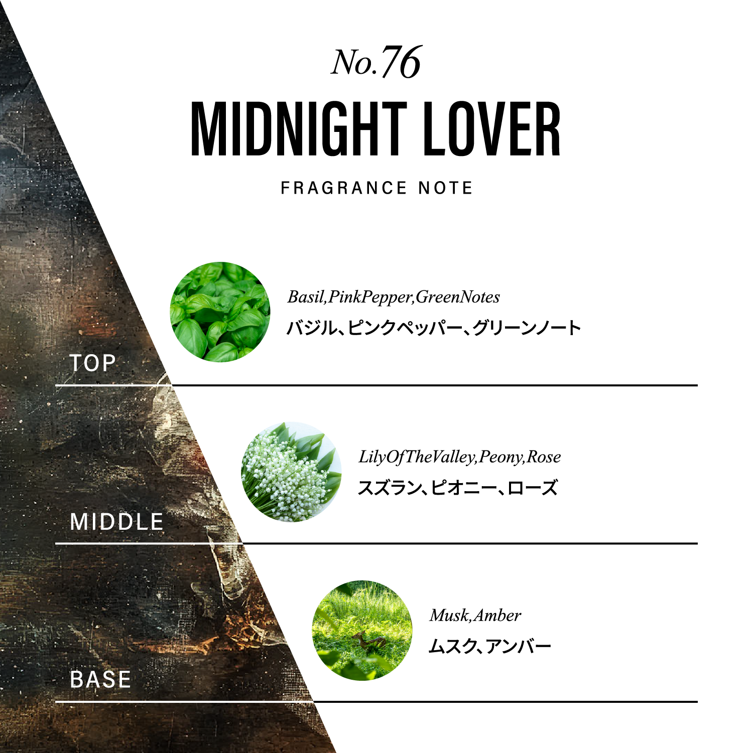 ラストノートでは、サンダルウッドとパチョリが深く香り、濃厚な余韻を長時間残す。