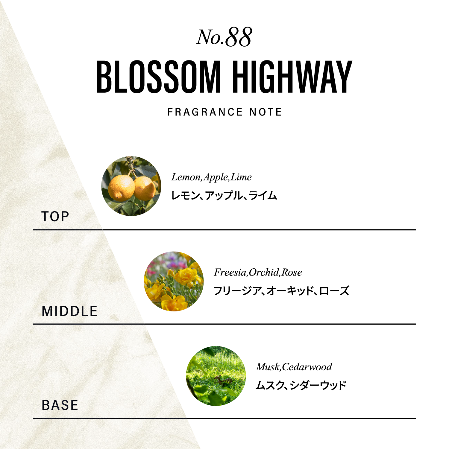 やさしく漂うフリージアの清潔感と、花々のエアリーで上品な甘さが調和。