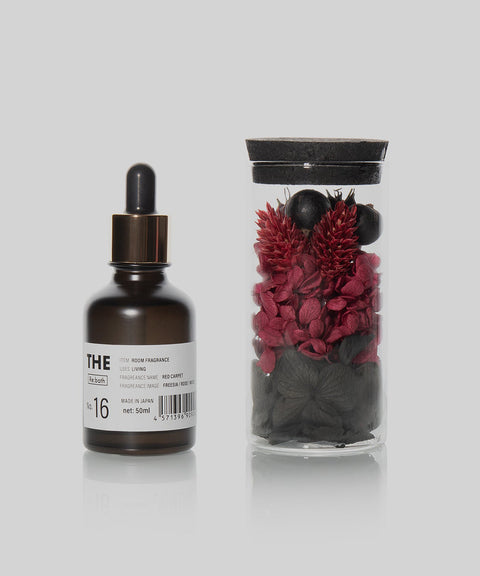 デザイナーの旅の記憶を閉じ込めたプリザーブドフラワーグラスに、情景を香りで描き出すルームフレグランスオイルを添えた特別なセット。