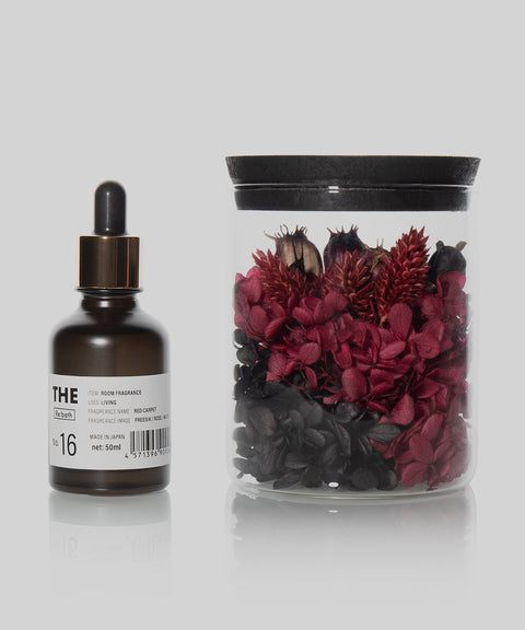 デザイナーの旅の記憶を閉じ込めたプリザーブドフラワーグラスに、情景を香りで描き出すルームフレグランスオイルを添えた特別なセット。