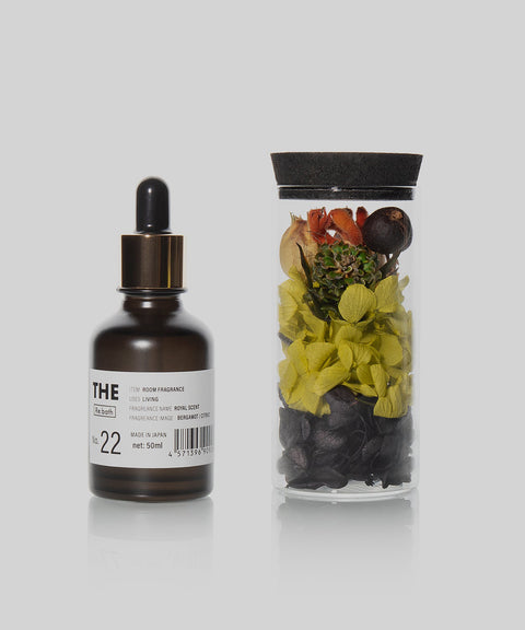 デザイナーの旅の記憶を閉じ込めたプリザーブドフラワーグラスに、情景を香りで描き出すルームフレグランスオイルを添えた特別なセット。