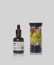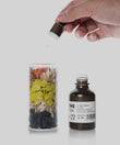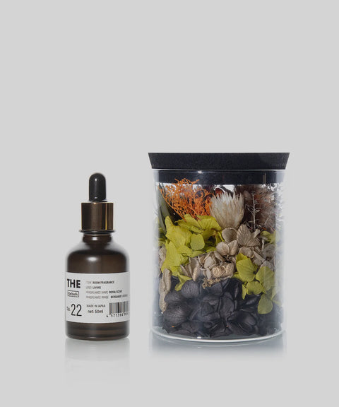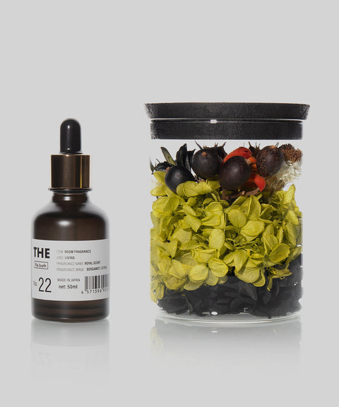 デザイナーの旅の記憶を閉じ込めたプリザーブドフラワーグラスに、情景を香りで描き出すルームフレグランスオイルを添えた特別なセット。