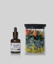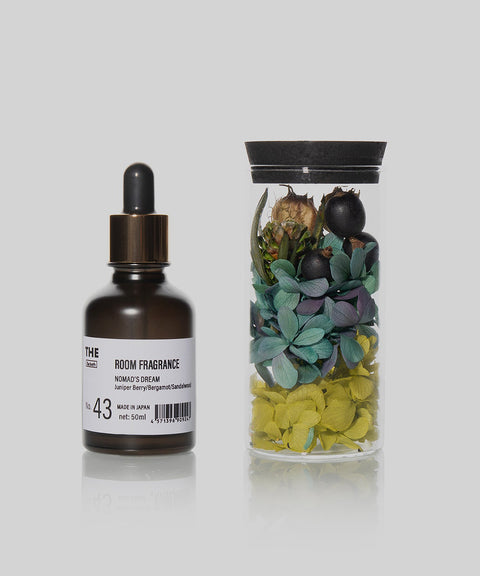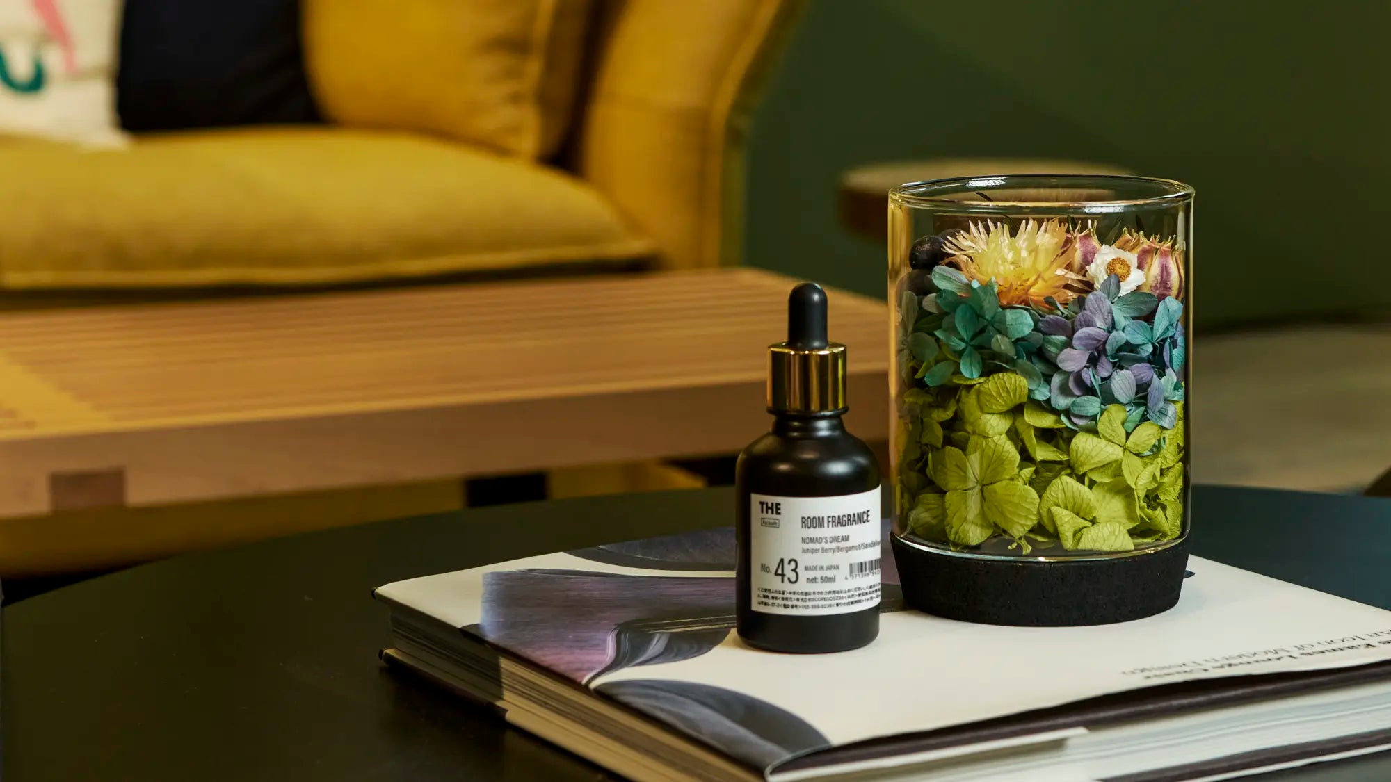 デザイナーの旅の記憶を閉じ込めたプリザーブドフラワーグラスに、情景を香りで描き出すルームフレグランスオイルを添えた特別なセット。