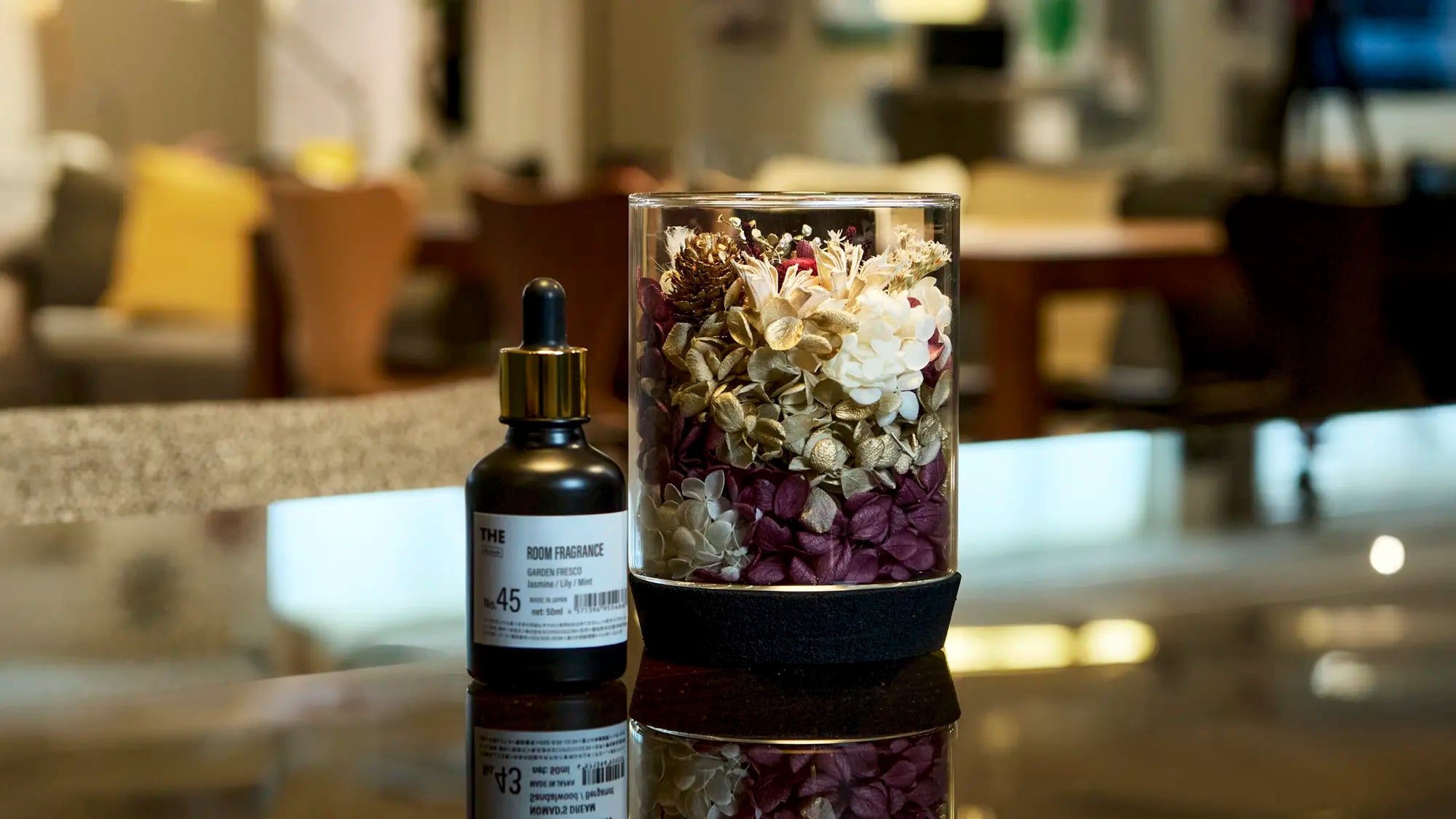 デザイナーの旅の記憶を閉じ込めたプリザーブドフラワーグラスに、情景を香りで描き出すルームフレグランスオイルを添えた特別なセット。