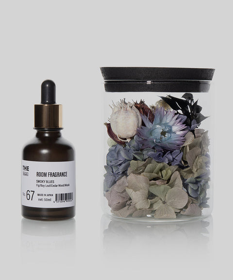デザイナーの旅の記憶を閉じ込めたプリザーブドフラワーグラスに、情景を香りで描き出すルームフレグランスオイルを添えた特別なセット。